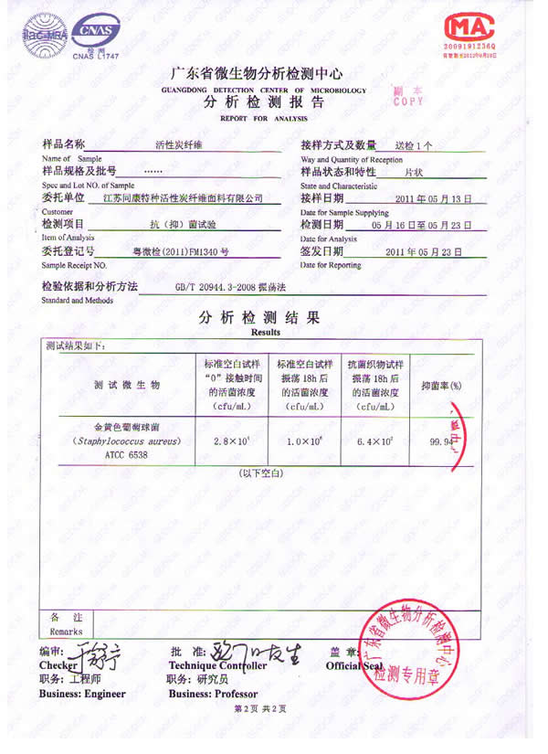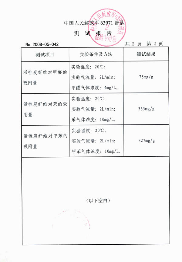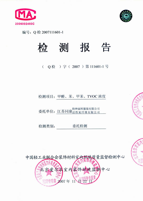 江蘇同康特種活性炭纖維公司生產(chǎn)的活性炭纖維居室凈味寶、汽車凈味寶獲得國家專利,特別適用于新裝居室、汽車或及新置家具里各種有害物質(zhì),尤其是致癌物質(zhì)、芳香族類的化合物(如苯類、醛類)的去除,使空氣潔凈清新,有利人體身心健康。該產(chǎn)品經(jīng)中國室內(nèi)裝飾協(xié)會環(huán)境監(jiān)測中心檢測對甲醛、苯、甲苯、有機揮發(fā)物(TVOC)的消除有明顯作用。